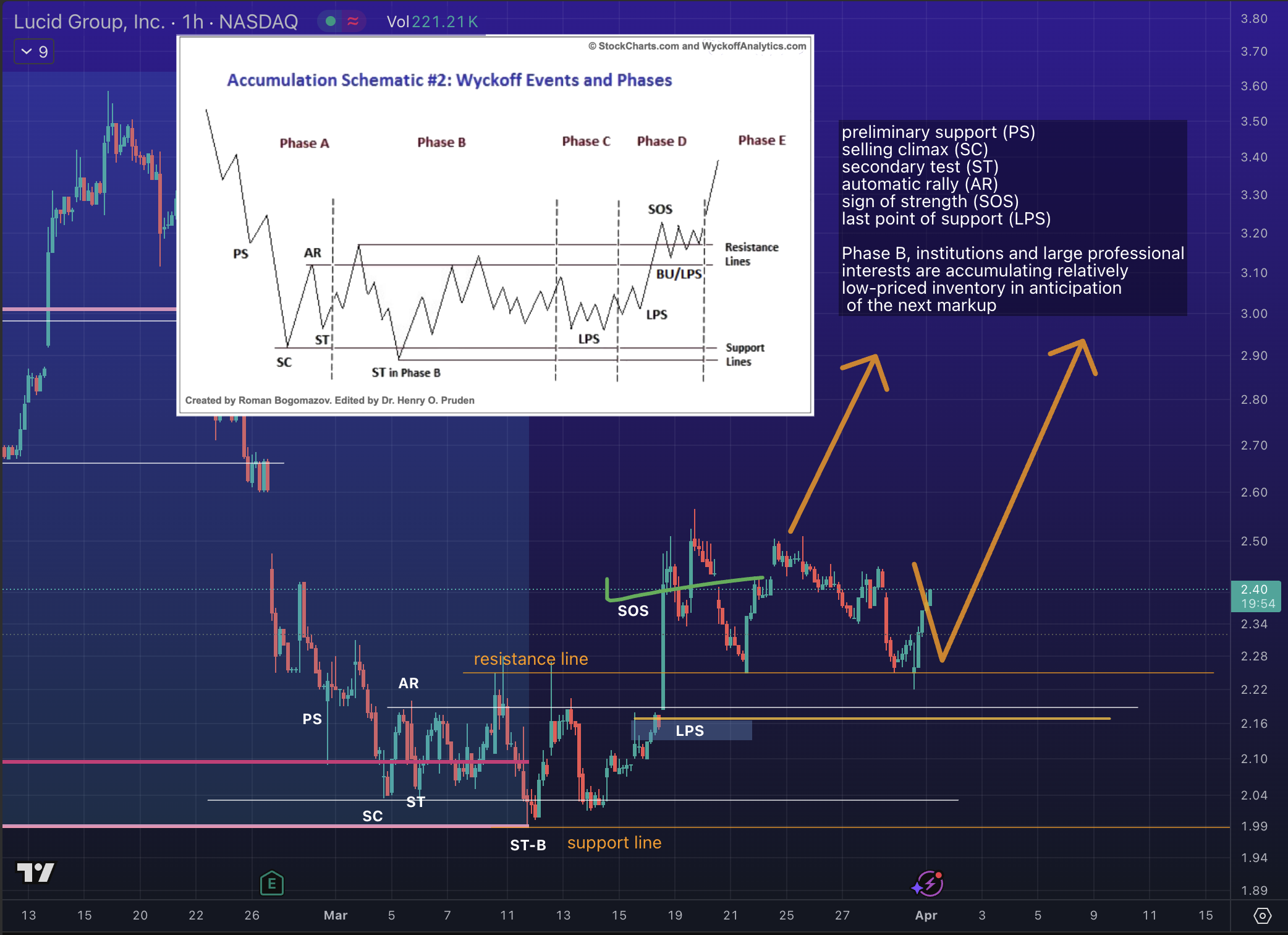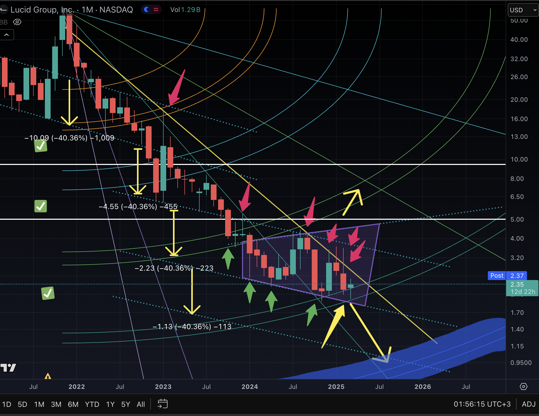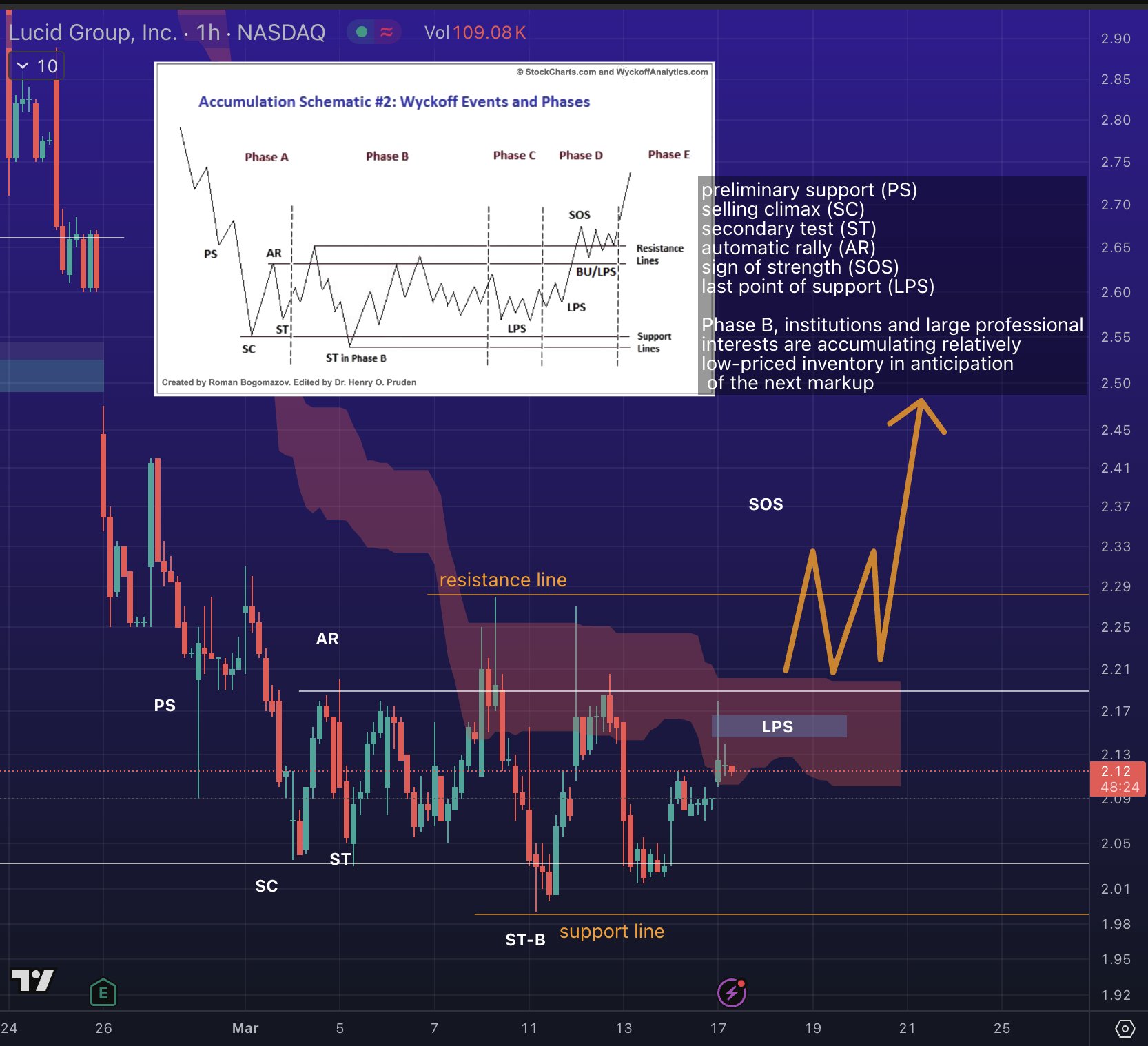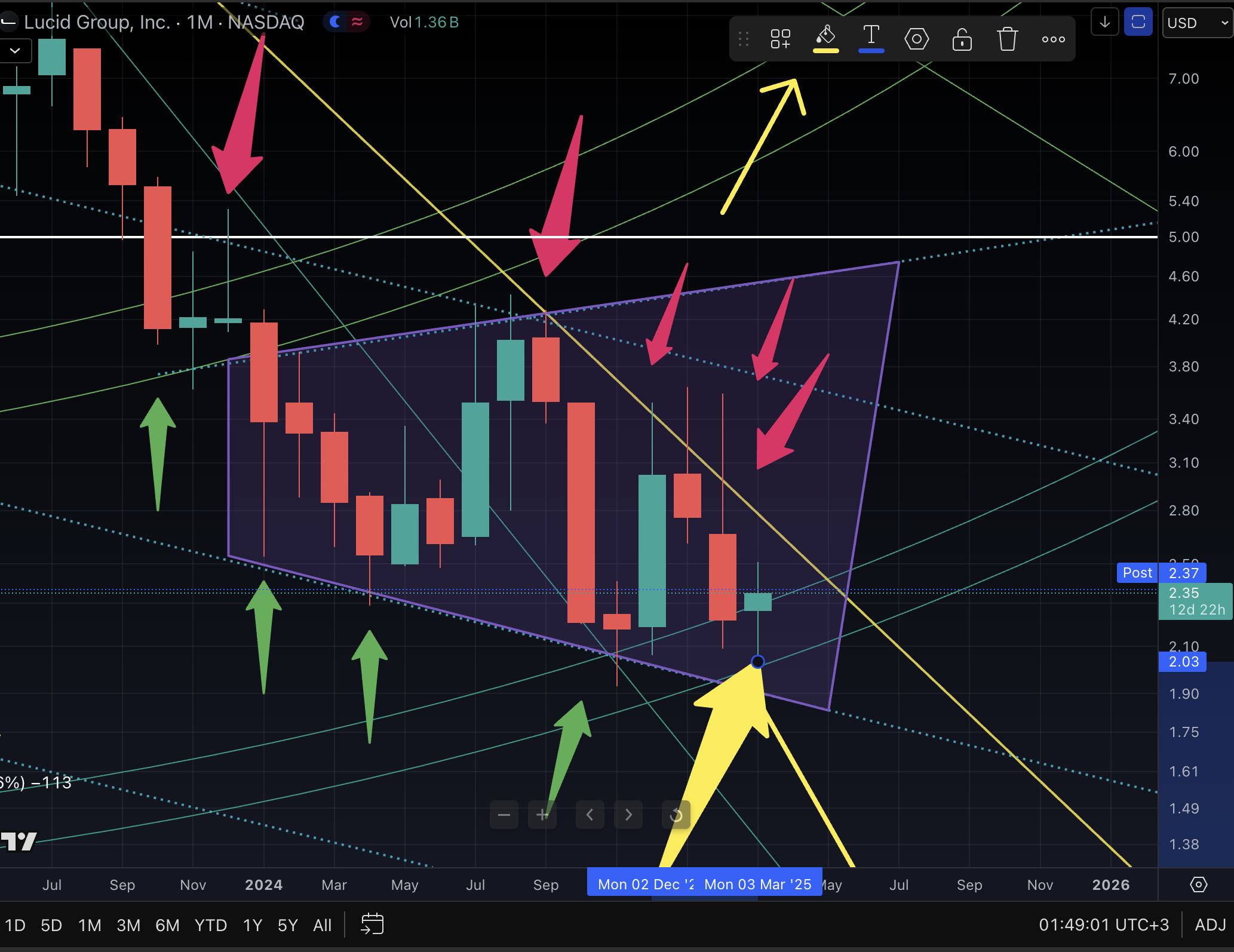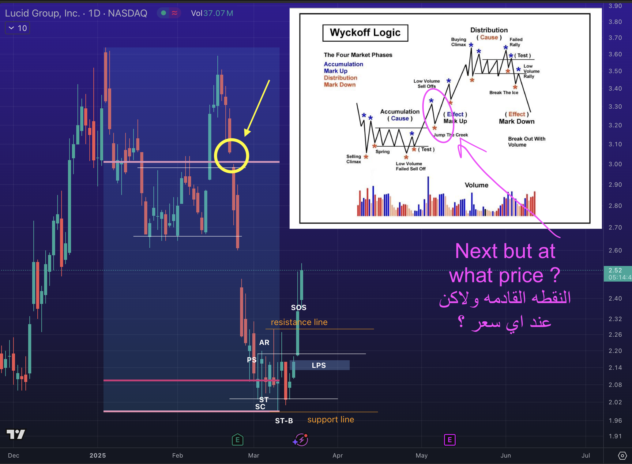 أغلق سعر لوسيد شمعة فبراير تمامًا عند مستوى الدعم (النظري) لمربع قان