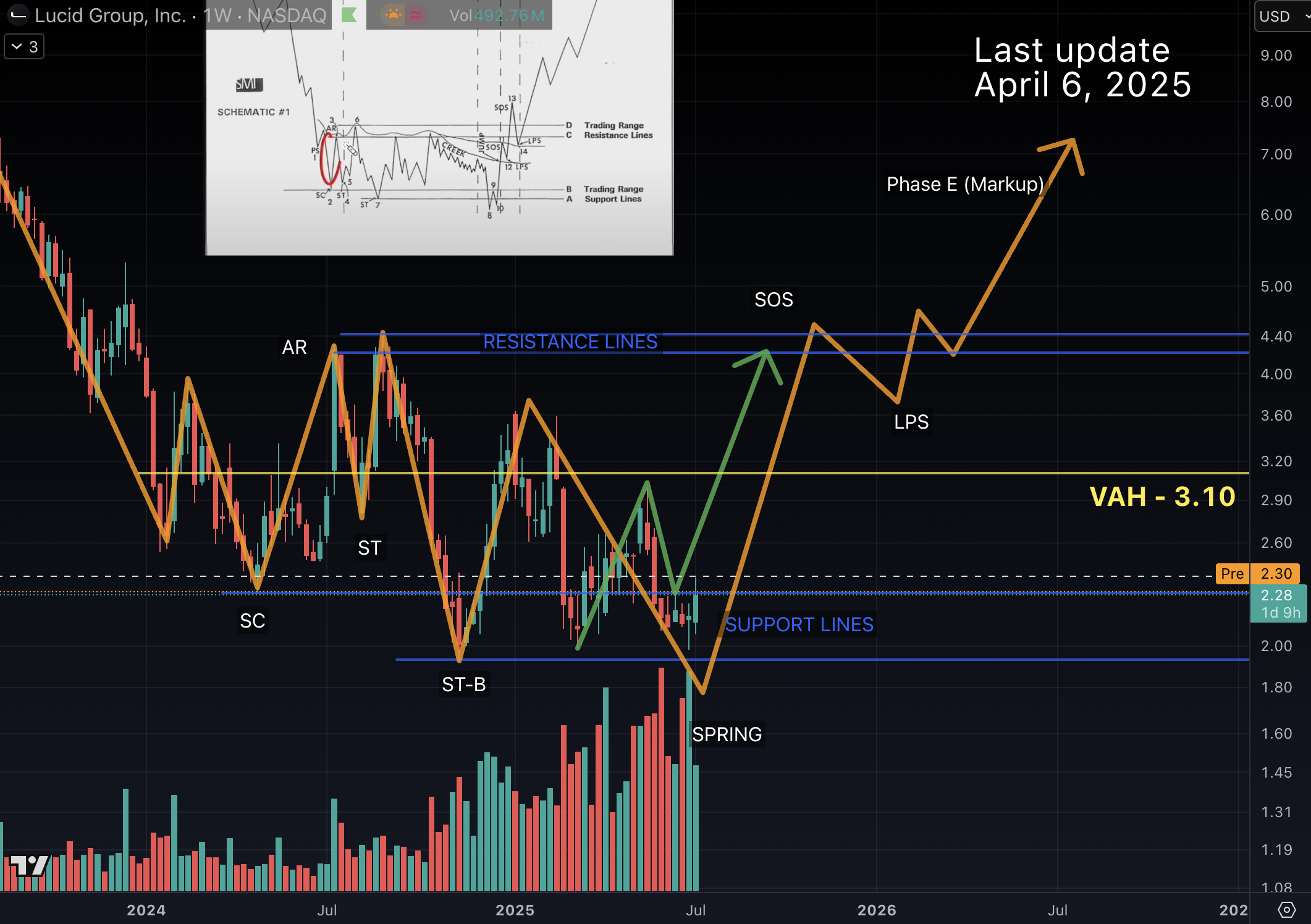 The orange line represents another potential and very valid bottoming pattern for Lucid, suggesting a possible price recovery below $1.94