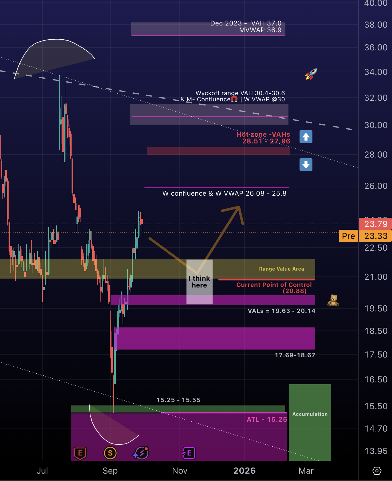 📍 Current level: $23.3, trading above the current range POC 20.88 — bulls are attempting to reclaim control.